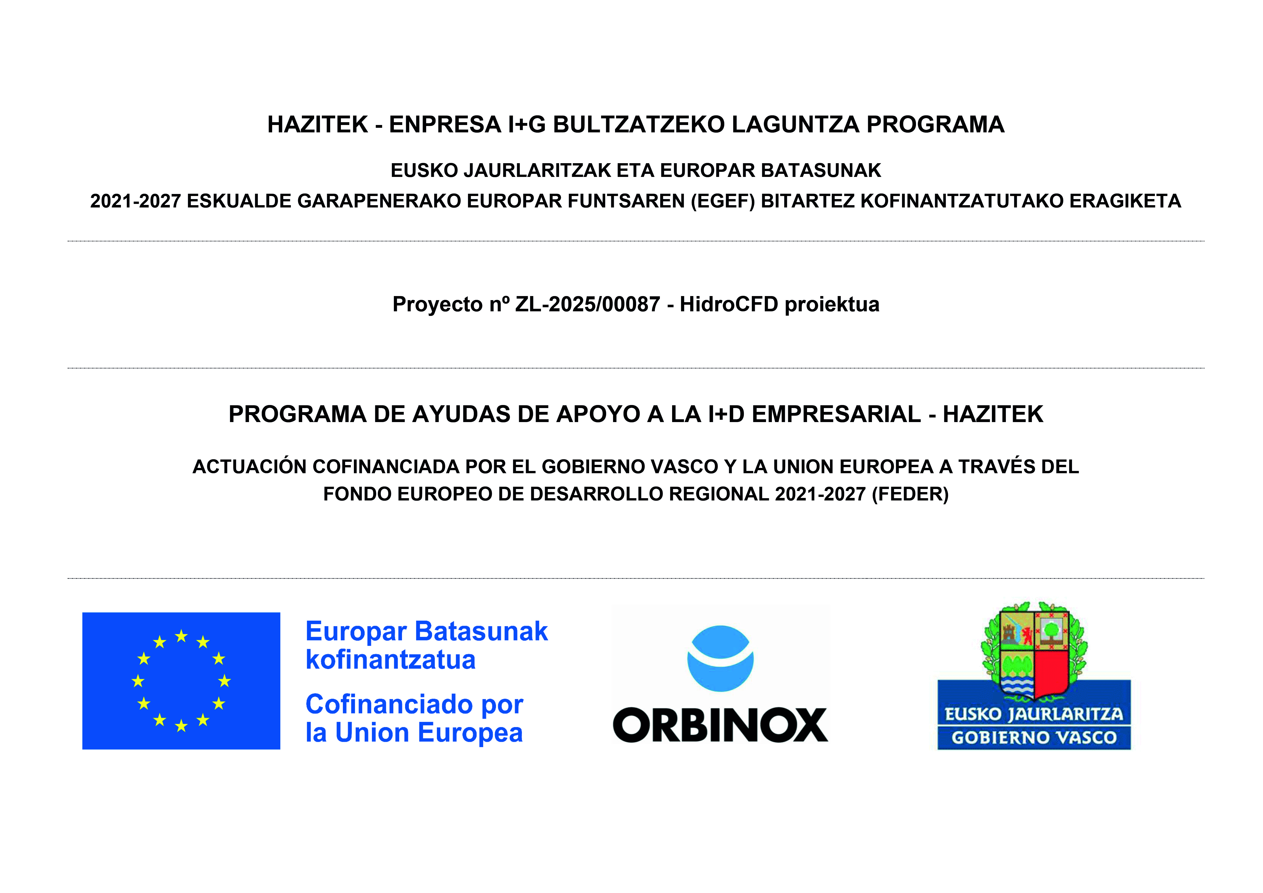 ORBINOX ha recibido el apoyo del programa HAZITEK 2025 para el proyecto de I+D HidroCFD. Este proyecto ha sido cofinanciado por el Gobierno Vasco y la Unión Europea a través del Fondo Europeo de Desarrollo Regional 2021-2027 (FEDER)